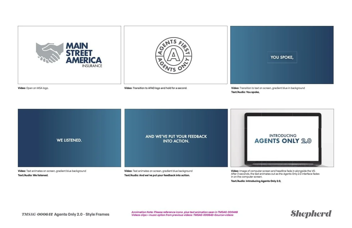Main Street America is a insurance company with private agents. This video was created to promote their brand ideals of prioritizing their agents by updating and customizing their online website to streamline and aid their agents by making their jobs easier in the day to day. We highlighted some key features as well as the fact that they had made these changes from a series of surveys and feedback from their teams. This video was storyboarded by the Art & Jr. Art director Maria Watson and Mason Mushinski.